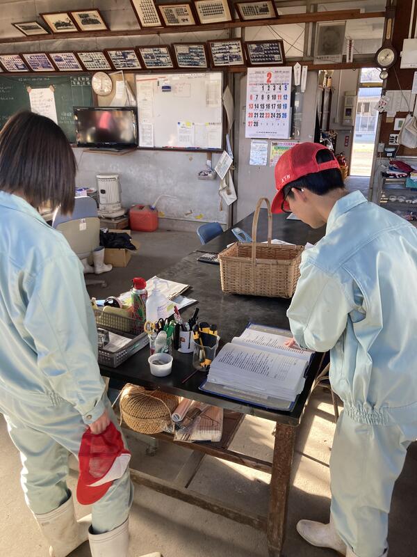 こちらは肥育牛の牛舎にて翌朝の飼料作りを、ホワイトボードを見ながら間違えないよう真剣に行っていました。