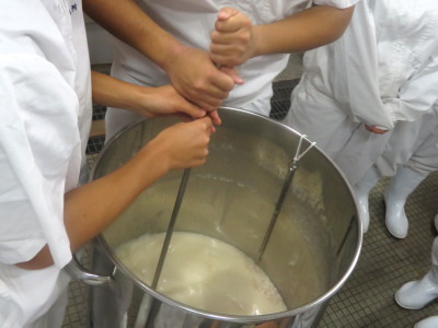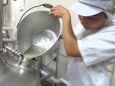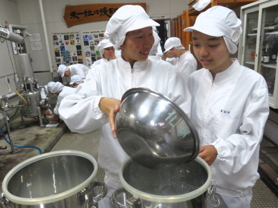 プラント焼酎の製造(常圧蒸留)~その4「蒸留」~(2018/10/26) 投稿日時 : 2018/10/26 投稿者4 食品科学科3年生が行っている、プラント焼酎の製造。二次仕込みから2週間後の今日は、蒸留(常圧蒸留)を行います。 二次もろみを発酵タンクから蒸留装置に移します。 蒸留された焼酎が流れ出るのを確認!焼酎が誕生する瞬間に、感動の声が上がっていました。 蒸留した焼酎は、2つのタンクで貯蔵します。かすかに白く濁っているのは、原料由来の油脂が含まれるためで、後日、油脂を取り除くための「ろ過」を行います。 製麹から3週間。もろみの発酵は順調に進み、十分なアルコール度も得ることができました。1月に実施する品評会でどのように評価されるか、楽しみですね!