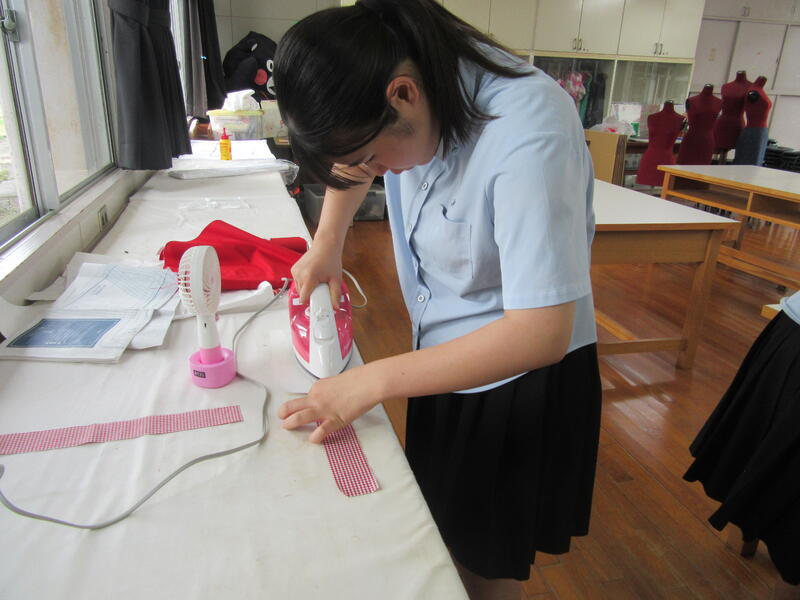 学校に戻って採寸の数字をもとに、前掛け・マスクを製作しました。
