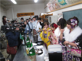 振り袖やスーツ姿の卒業生たちは、焼酎が入った特大瓶や3升かめを開栓