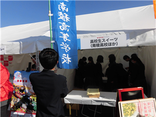 開店準備中 南稜高校のはっぴを着ていよいよ販売開始! 最初のお客様は向かい側に出店されている