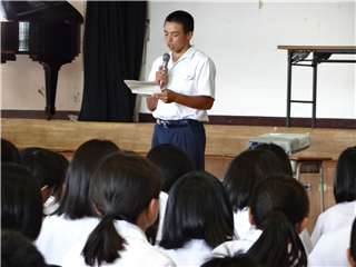 生徒会長 坂本君から、「いじめ防止等のための対策への提言」がありました。