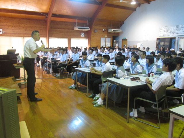 ・山江中学校 学校説明会 (2018/7/13) 投稿日時 : 2018/07/14 学校サイト管理者 ・山江中学校 学校説明会 (2018/7/13)7月13日(金)山江中学校で学校説明会がありました。1年、2年、3年生の全校生徒の皆さんと保護者の方が対象です。南稜高校クイズを出して、盛り上がりました。