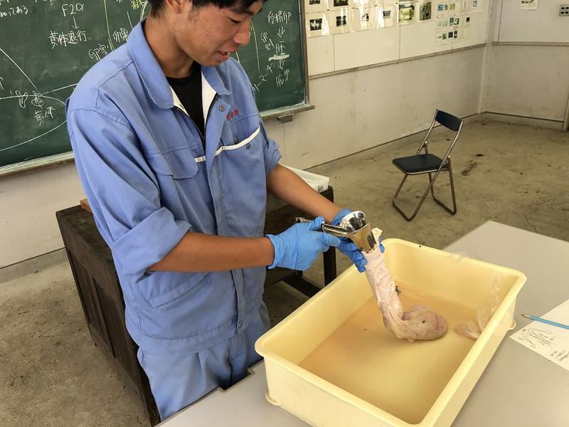 この学年は特に専門知識に対する学習意欲が高いと感じます。今回の実習は繁殖の入り口。今回見たことや触った感触を頭に焼き付けておくことが大切です。その記憶と今後の練習や学習によって、大きな知識を身につけることができるかどうかが決まります。練習を頑張って下さい。
