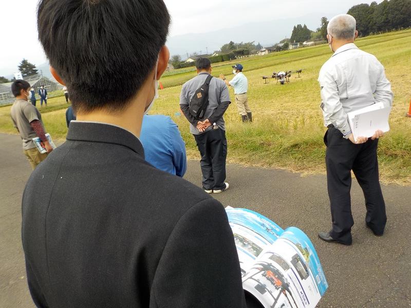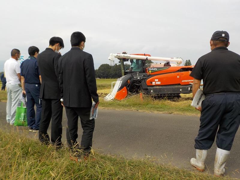 スマート農業に関するコンバイン等実演会に参加 投稿日時 : 2020/10/16 投稿者3 10月16日(金)に県球磨農業研究所でスマート農業を学びました。 アシストスーツの体験をすることができました。重い荷物を楽に運ぶことができます。 当所の水田に移動し、新型のドローンのデモ飛行を見学しました。10分で1.5haの散布が可能だそうです。 アグリロボコンバインの実演も見学しました。運転手の方は操作レバーから手を離した状態で収穫されていました。今後もスマート農業について学習します。