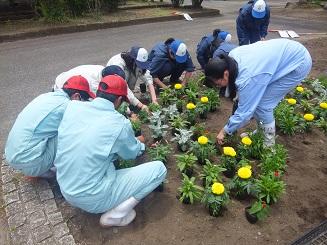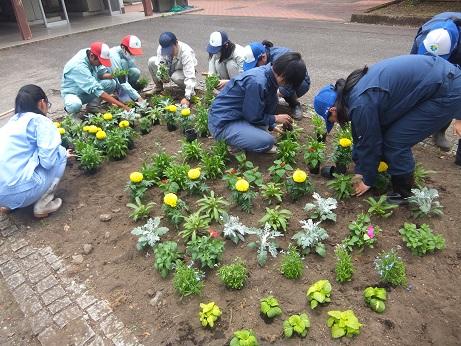 花壇づくり 投稿日時 : 2019/05/17 学校サイト管理者 総合選択でグリーンライフを選択した3年生が昇降口前の花壇の装飾を行っていました。マリーゴールドなどいろいろな花を丁寧に定植しています。デザインは2つのハート。登校時と下校時にそれぞれハートマークが見えるようにデザインし、生徒たちに元気を分け与えるそうです。手前の空いた花壇には今後、コキアを植えていく予定だそうです。 総合選択ですので、学ぶ生徒の学科もそれぞれ。実習服の色も異なりますが、普段一緒に学ばない生徒たちがみんな仲良く学んでします。