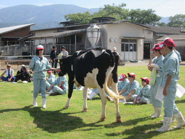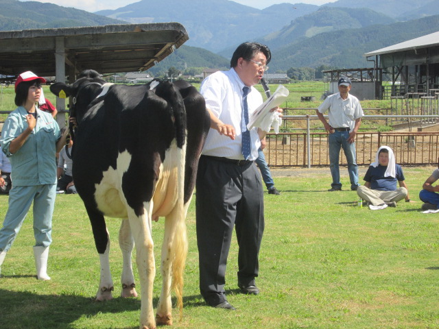 ・バーンミーティング(2018/9/19) 投稿日時 : 2018/09/19 学校サイト管理者 ・バーンミーティング(2018/9/19)9月19日(水)バーンミーティングが神殿原農場で行われ2年生と農家さんらが参加。北海道帯広市のオールジャパン ブリーダーズサービス株式会社の竹田秀臣総務部長が、乳牛の統一スコアについて説明。乳器40%、デーリィキャラクター20%、肢蹄15%、骨格15%、体積10%で判断。5つの主要部位を、細かく説明がありました。その後、農場の牛3頭A・B・Cを各自で採点し、「序列回答シート」に記入し、箱に投票しました。その後、竹田部長から、順位の発表がありました。午前の部では、農家20件の内、正解は3件という結果で、難しい問題でした。バーンミーティング=熊本県乳牛改良同志会技術向上研修会松野会長や熊本県酪農農業協同組合連合会の森本さんらが参加。序列回答シートに回答し投票します正解を発表し、説明がありましたA→C→Bの順に評価が高い牛でした