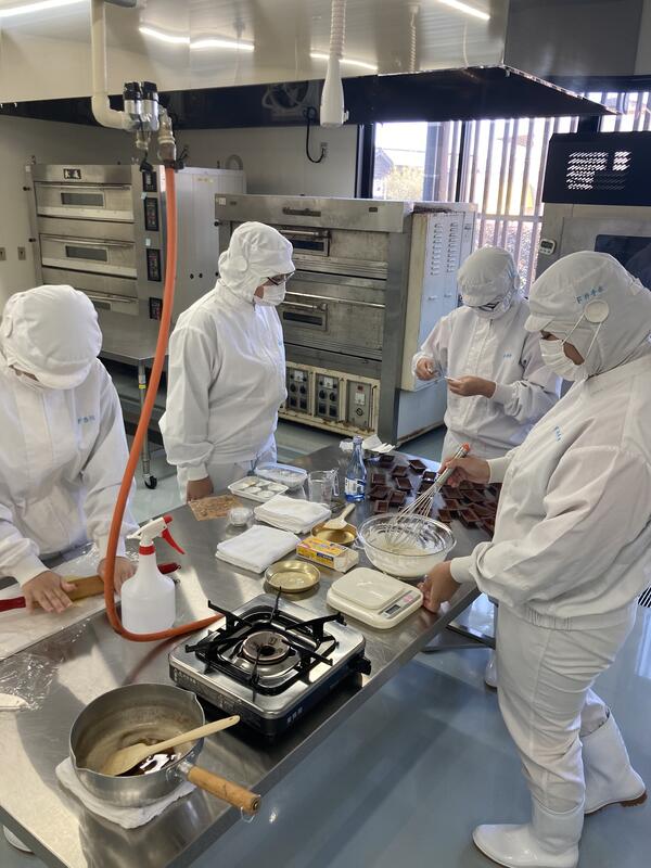 また、本日は、1.2限目の時間に、生徒達が考案した商品の試作・製造にご協力をいただいている「有限会社あさぎり町ふるさと振興社」へ伺い協同での実習を行わせていただきました。