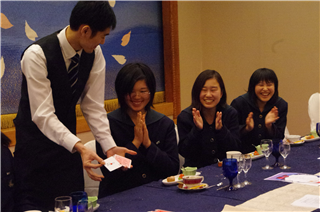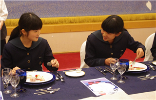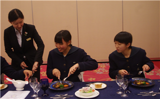 テーブルマナー講習会がありました☆ 投稿日時 : 2015/12/17 学校サイト管理者 生活経営科3年は、あゆの里にて「テーブルマナー講習会」を実施しました。様々な種類のカトラリーと豪華な料理を前に少し緊張した様子でした。ナイフとフォークの使い方や、料理に応じたマナーなど学ぶことができました。料理のおいしさに感動し、笑顔がこぼれる場面も。クリスマスプレゼントに手品を披露して頂き、素敵な思い出になりました。~講師の方に教えて頂きながら~~隣同士で確認しながら慎重に~~牛ロースステーキのおいしさに感動!~~手品に大喜び!!~