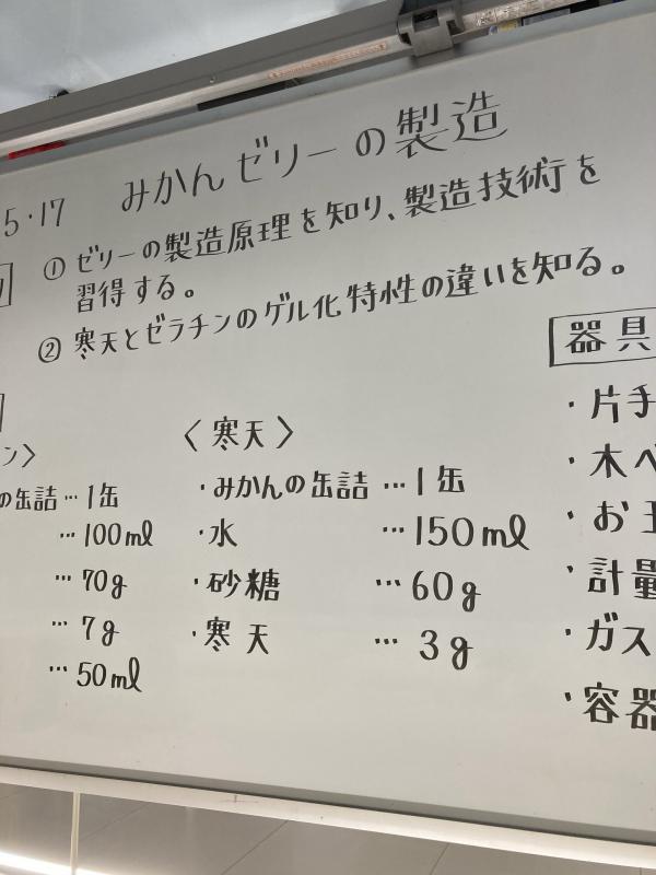 【食品科学科2年】食製 ゼリー製造実習 投稿日時 : 2021/06/16 投稿者5 2年生の食品製造の授業でゼラチンと寒天を使用し違いについての実習を行いました^_^ まずはゼラチンから 次は寒天です! 写真では違いがあまりわかりませんが、食べ比べてみていかがでしたでしょうか!! 感想を聞かせてくださいね タグ 食品科学科