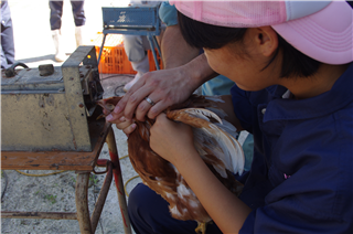 生活経営科1年 デビーク 投稿日時 : 2015/07/16 投稿者5 7月15日(水)1・2時間目の農業と環境の時間に生活経営科1年生は鶏のくちばしを切るデビークをしました。デビークとは尻つつきを防ぐために行うようものです。入学当時は鶏を抱くのにも抵抗をしていた1年生ですが・・・・怖がらずに抱けるようになりました。先生に教えてもらいながら頑張っています。 養護のM先生と担任のT先生も実習しました。11月には解体実習が予定されています。今後も実習の様子をアップしていきます!!