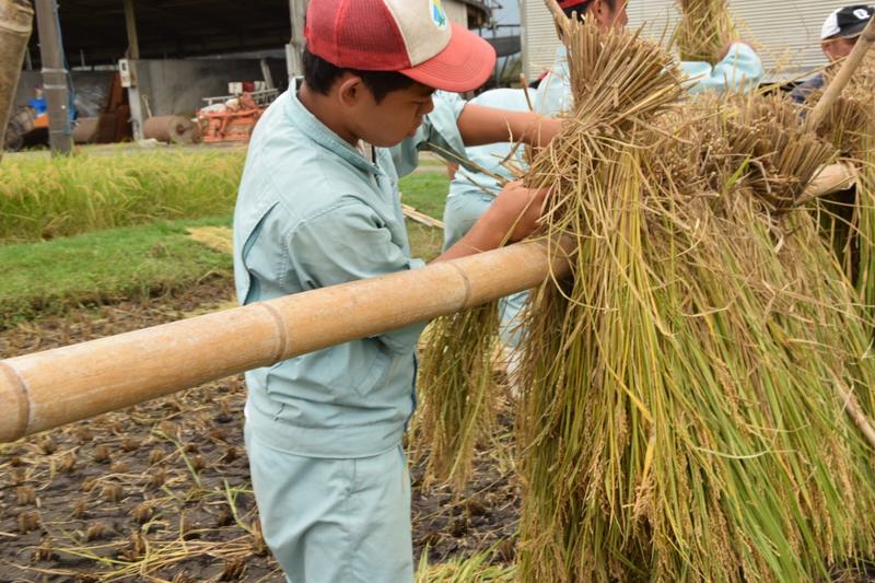 南稜米の竿干し 投稿日時 : 2019/10/04 学校サイト管理者 10月2日、南稜米を竿干してしました。コンバインで刈り取りを済ませるのではなく、バインダで刈り取り、竿に干して、ハーベスタで脱穀します。手間はかかりますが、今でも球磨地域ではよく見かける方法で、本校でも継続的に行なっています。 現在、案山子も出現しています。