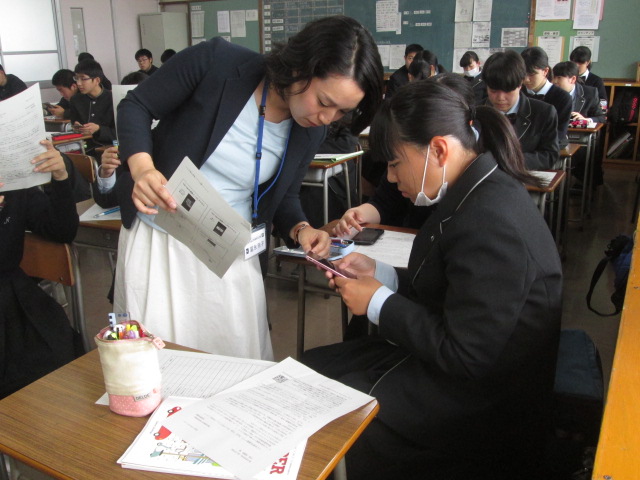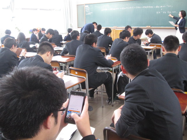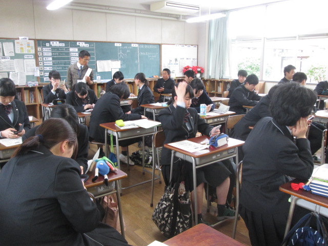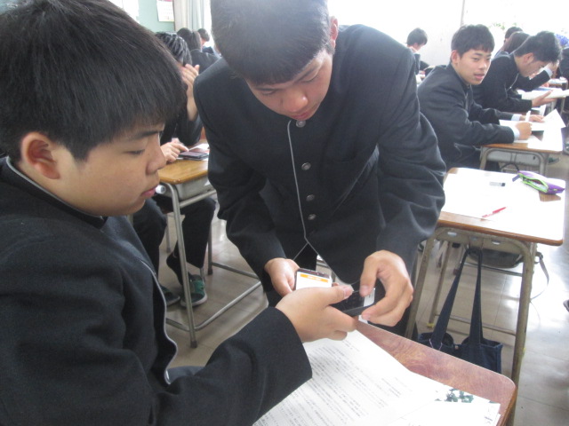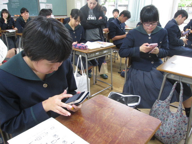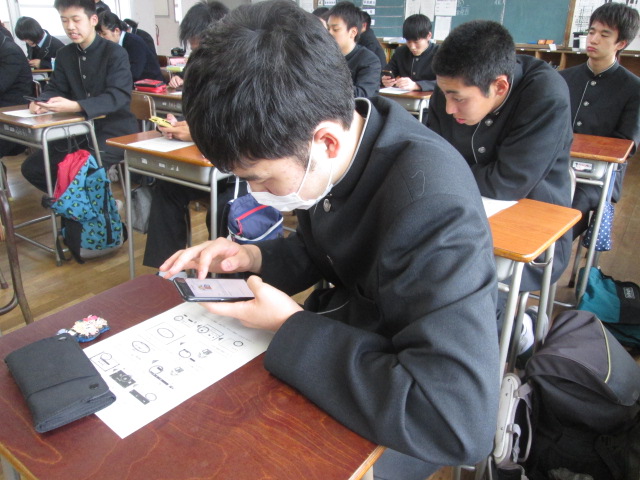 終礼時に、各HRで担任の先生の説明のもと、アプリ登録・テスト送信をしました。