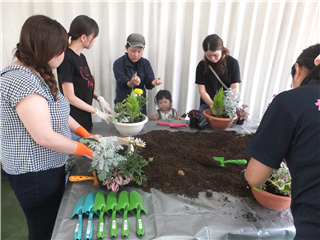 むつみ保育園親子草花寄せ植え講習会 投稿日時 : 2018/06/12 投稿者2 今日は、むつみ保育園の親子を対象に、草花の寄せ植え講習会を行いました。「値段が安い土と高い土の違いは?」「綺麗に見える花の組み合わせは?」「肥料はいつのタイミングで?」生徒たちとは違った視点での質問に、参加者の方々の熱意を感じました。できあがった作品も、個性に溢れ、どれも素敵なものばかり。「これまで、こんなことはしたことがなかったけど、こんなに簡単だったらできそう!ありがとうございました!」草花に触れる楽しさを伝えている私たちにとって、とても嬉しいお言葉です。このような機会を提供させて頂き、私たちも感謝です。楽しい時間を、ありがとうございました!
