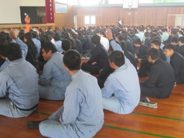 ・防災避難訓練(2018/12/7) 投稿日時 : 2018/12/07 学校サイト管理者 ・防災避難訓練(2018/12/7)12月7日(金)防災避難訓練を行いました。いつ、どこで、何が、どのように、発生するのか分からない避難訓練です。10:18地震が発生し、学習センター棟から火災が発生、初期消火に失敗し、火災が広がっているものとして、避難訓練でした。体育館を避難場所とし、避難。けが人、負傷者がいたり、立ち入りが出来ない場所も発生したことを想定。上球磨消防署の方から、指導を頂きました。また、消火器を使っての消火訓練も行いました。通報と放送