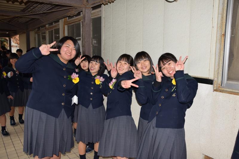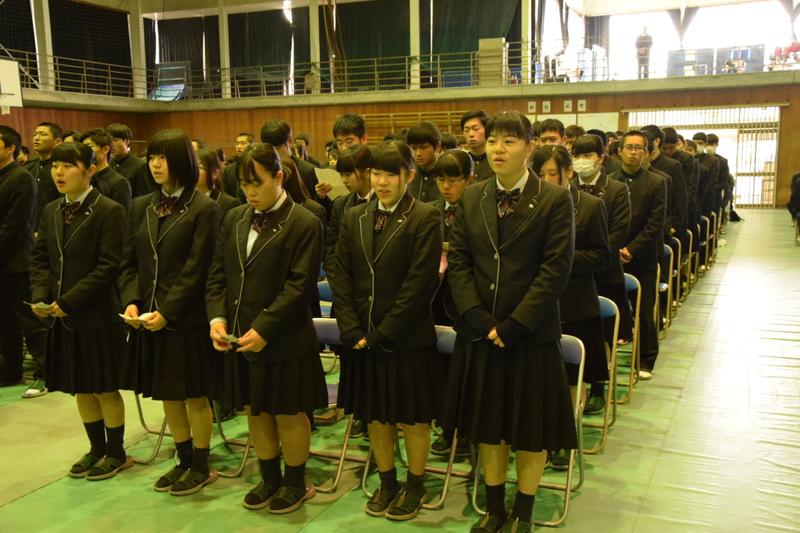 卒業式 投稿日時 : 2019/03/01 学校サイト管理者 入場 神殿原賞授与 開会 卒業証書授与 校長祝辞 県教育委員会挨拶 来賓祝辞 送辞 答辞 校歌斉唱 記念品贈呈 3学年担任と学年主任 入場前の一コマ