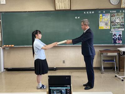 【9.2令和6年度2学期始業式・表彰式】 投稿日時 : 2024/09/03 承認者 先月28日に始業式の予定でしたが台風で休校となり昨日行いました。体育館の暑さも考慮し、今回も各教室内で中継をしながらの始業式でした。始業式の前には表彰式が行われました中継ではありましたがが、表彰の際には各クラスから大きな拍手が聞こえたり、校長先生のお話も真剣に聞いていました。 さすが南稜生2学期の学校生活も挑戦する気持ちを大切に取り組みましょう 【表彰式の様子】 表彰者一覧→HP用R62学期始業式表彰.pdf 【始業式の様子】