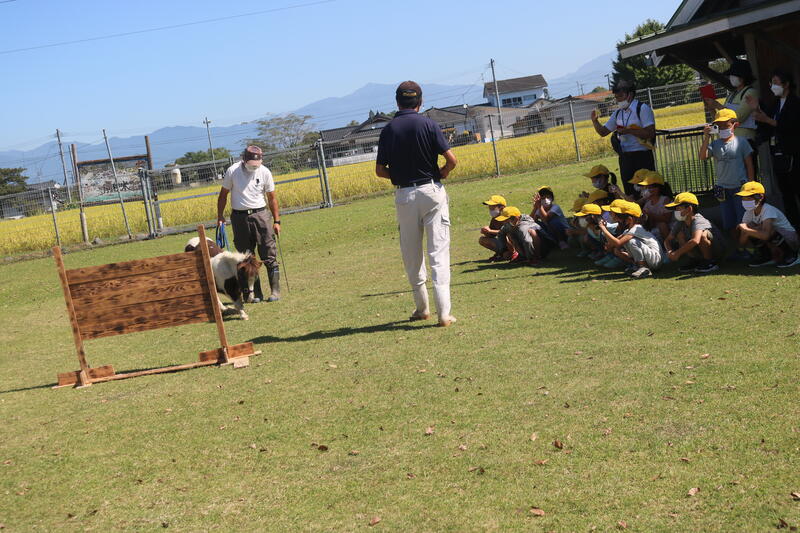 小動物舎にいる犬・ウサギ・ポニー・ヤギについて、クイズ形式で問題を出して小学生に答えてもらい、その後、動物たちに触れながら動物について楽しく知ってもらいました。