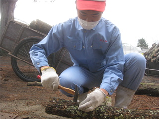 次に、開けた穴に種駒(シイタケ菌の蔓延した木片)を金槌等で埋め込みます。
