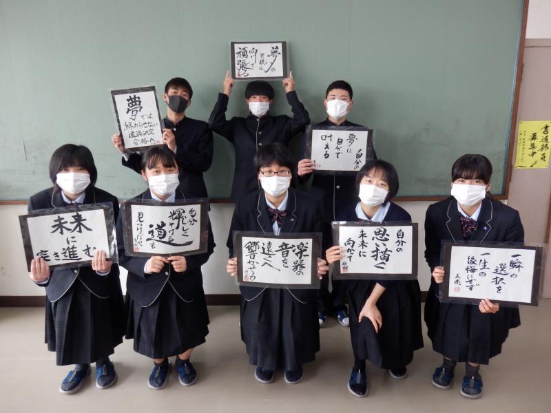 【書道Ⅱ】漢字仮名交じりの書 作品完成 投稿日時 : 2021/03/23 投稿者3 2年生総合選択Aでは、「漢字仮名交じりの書」の創作活動をしました。 これまでの作品制作で身につけた技術を発揮すべく、書体、書風(書きぶり)にもこだわりました。 今回は"自作の詩"で作品を制作しました。 内容は、3年生の0学期ともあり、進路に関する内容が多かったように思います。 最後は、授業で完成させた印を押し、完成させました!!