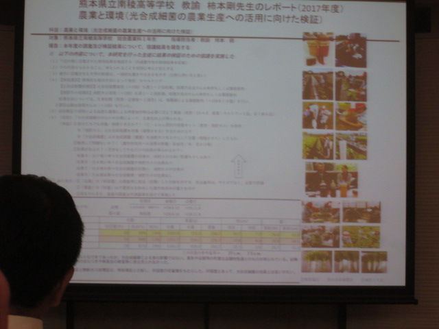 ・崇城大学との意見交換会【SPH】(2018/8/29) 投稿日時 : 2018/08/30 学校サイト管理者 ・崇城大学との意見交換会【SPH】(2018/8/29)8月29日(水)KKRホテル熊本で崇城大学との意見交換会が行われました。崇城大学から中山峰男学長をはじめ、各学部長、農業関係高校の校長や教職員らが参加。応用生命科学科の宮坂均教授が、南稜高校の光合成細菌の取組を紹介しました。南稜高校の取り組みが紹介されました中山学長 あいさつ