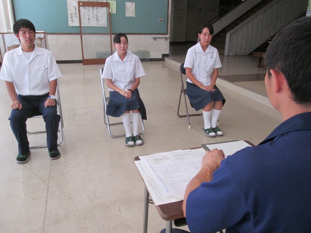 ・3年生 頑張っています (2016/8/24) 投稿日時 : 2016/08/24 学校サイト管理者 ・3年生 頑張っています (2016/8/24)8月24日(水)、8月も終盤、3年生は追い込みにかかっています。一人一人、それぞれの課題に取り組んでいます。写真は、面接の練習。