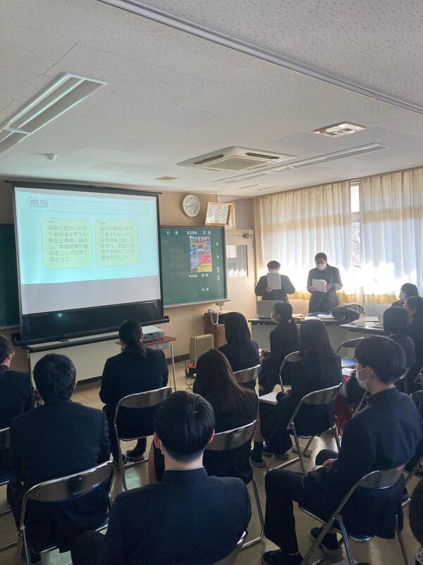昨年の2月からスタートしたこの3年次における課題研究では、試作品の製造から本日のパワーポイントを用いた発表会まで大変多くの苦労があったかと思います。この発表会を通して皆さんの頑張りがよく伝わりました。残り少ない学校生活です。卒業論文や学年末考査もありますが、最後の高校生活思いっきり楽しんでください!!!