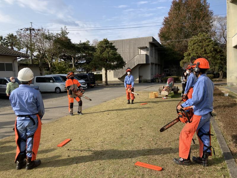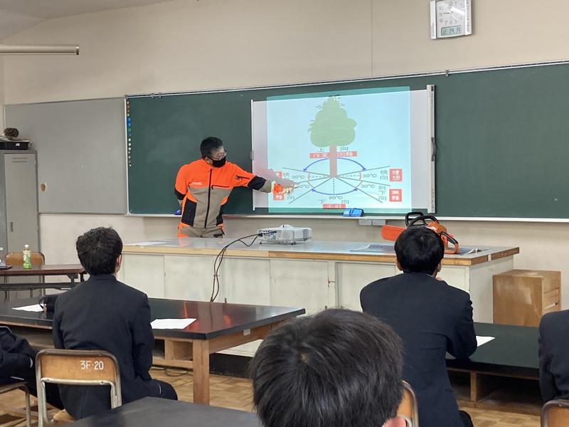 2年総合農業科環境コースの生徒は、明日本校演習林にて間伐・高性能林業機械研修を受講します。この研修は、林業現場で活躍する高性能林業機械やチェーンソーでの立木の伐倒技術について知識・技術を深める研修で毎年行っています。本日は、球磨地域振興局の方をお招きし、明日の研修に向けた事前指導を行っていただきました。
