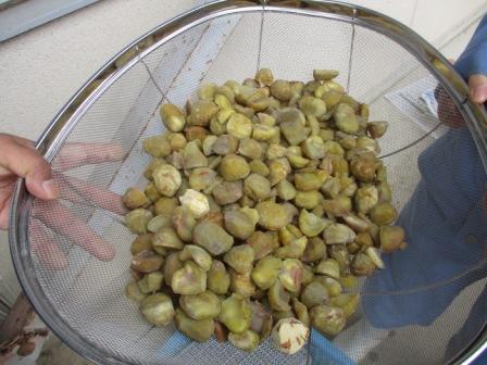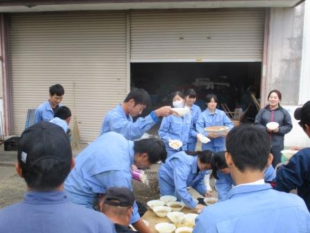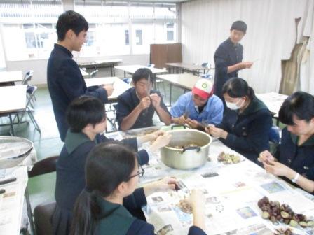 プレ収穫感謝祭 栗ご飯 投稿日時 : 2018/11/03 投稿者2 生産科学科作物専攻と園芸科学科課題研究果樹選択生で、それぞれの生産物を食材に栗ご飯をつくりました。前日は栗の皮むきです。ひたすらむきました。集中力と手先の器用さが試されます。ぜいたくに栗を多めに使って、栗ご飯づくりです。火加減調節も大切な役割です。美味しそうにできあがりました。会食風景 まずはおにぎりで自然の恵みに感謝しておいしく頂きました。