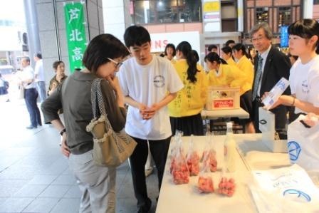 熊本市内上通り入口の「びぷれす広場」で開催された第4回農業高校フェアに生活経営科3年課題研究食物班、農業クラブ役員生徒が参加しました。このイベントは農業高校の教育活動の魅力を県民の皆様にPRすることを目的として開催され、イベントの模様は後日、RKKでも放映されます。