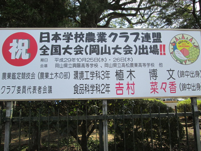 ・日本学校農業クラブ全国大会(岡山大会) 出場 (2017/10/13) 投稿日時 : 2017/10/13 学校サイト管理者 ・日本学校農業クラブ全国大会(岡山大会) 出場 (2017/10/13)10月25日(水)~26日(木)に岡山県で行われます、第68回日本学校農業クラブ全国大会に、環境工学科3年植木君、食品科学科2年吉村さんが出場します。植木君は、農業鑑定競技(農業土木の部)、吉村さんは、クラブ員代表者会議に出場します。頑張ってください。