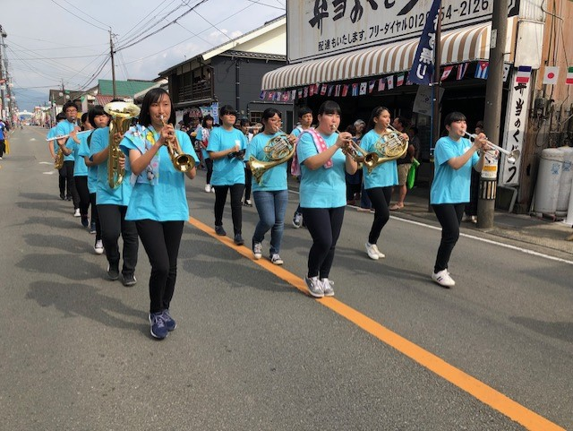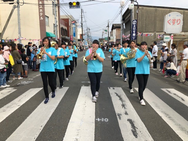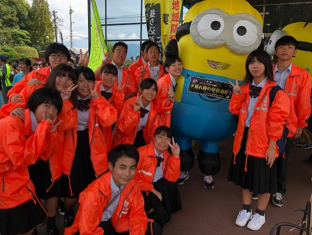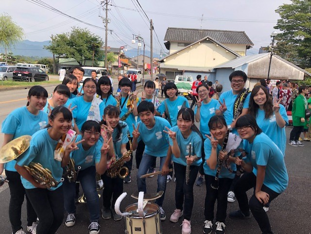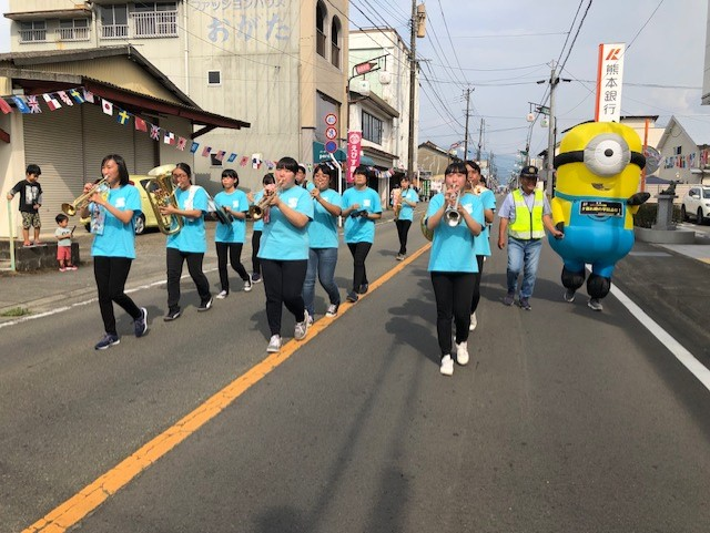 ゑびす祭りパレード 投稿日時 : 2019/10/20 投稿者6 ゑびす祭りパレードに吹奏楽部・生徒会・ボランティアの生徒たちが参加。 味岡建設を出発し、多良木町社会福祉協議会までを歩きました。 吹奏楽部にとってパレードの経験は初めて! 歩きながらの演奏は大変ですが、沿道の方々にも手拍子をして頂き、楽しく演奏する事が出来ました。 生徒会・ボランティアの生徒たちは、防犯の啓発とグッズの配布。 急遽ミニオンとして?!の参加もありましたが、無事終えることが出来ました。 今後も地域行事に積極的に参加をして行きたいと考えています!