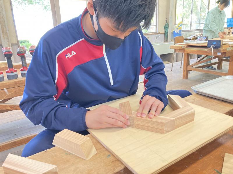 2年生の総合選択Aで「林産物利用」を選択している生徒は、南稜祭での木製品販売に向けて『六角プランター台』の製作に動き出しました六角プランター台はスギ材の木片を接着させてつくる可愛らしいプランター台で、南稜祭では大好評いただいている製品になります