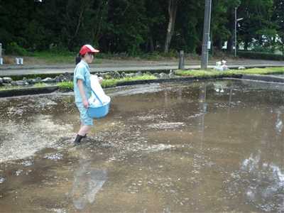 EMボカシ肥は手作業で行っていきます。水田を区画に分けて、自分の場所を責任を持って散布していきます。風で流され自分にかかることもありますが、そんなことも気にしません!