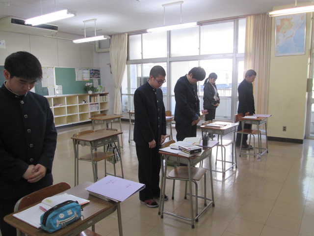 ・熊本地震 一斉黙祷 (2017/4/14) 投稿日時 : 2017/04/14 学校サイト管理者 ・熊本地震 一斉黙祷 (2017/4/14)熊本地震から1年が経ちました。熊本地震で被災された方々に哀悼の意を表し、午前10時、一斉黙祷を行いました。