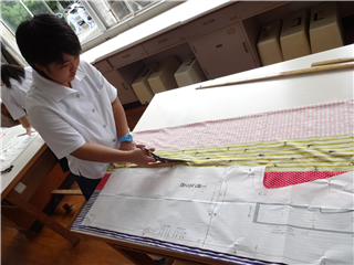 3年総合選択「服飾手芸」~甚平製作中♪~ 投稿日時 : 2015/09/03 学校サイト管理者 2学期始まって最初の総合選択の授業がありました。現在、大きな作品を製作中。布やはさみを正しく扱いながら、裁断をしています。1学期には家庭科技術検定4級に合格しました!今年中に完成予定♪さて、何ができるのでしょうか?! ~はさみの背はテーブルに付けて裁断~ ~柄にもこだわりがあります♪~ ~3年「服飾手芸」選択者11人、1人に1台のテーブル。充実した実習環境~