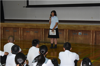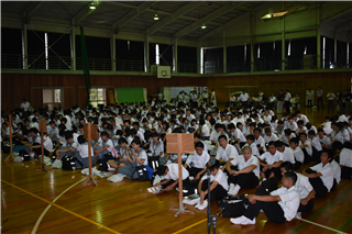 ~体育館にて全体説明:暑い中、みんな集中して話しを聞いてくれました~
