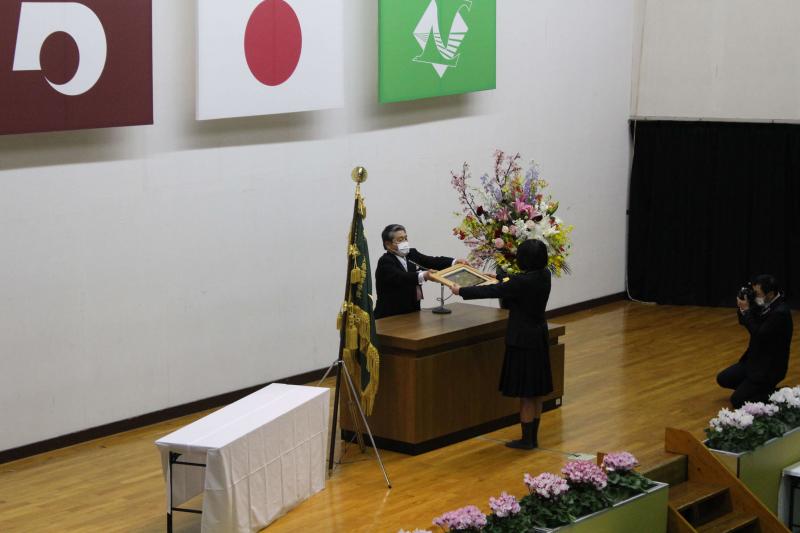 会に先立ち・本学年の生徒会長を務めた北川さんに神殿原賞が授与されました。