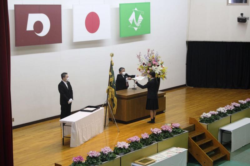 卒業証書授与 担任が生徒を一人ずつ呼名したあと、クラス代表生徒が卒業証書を受け取りました。