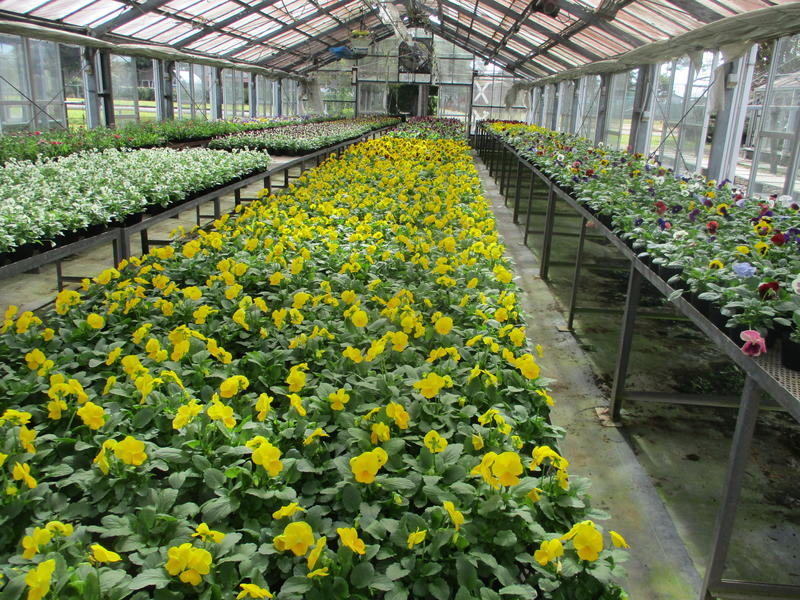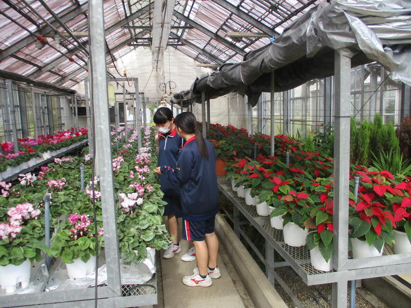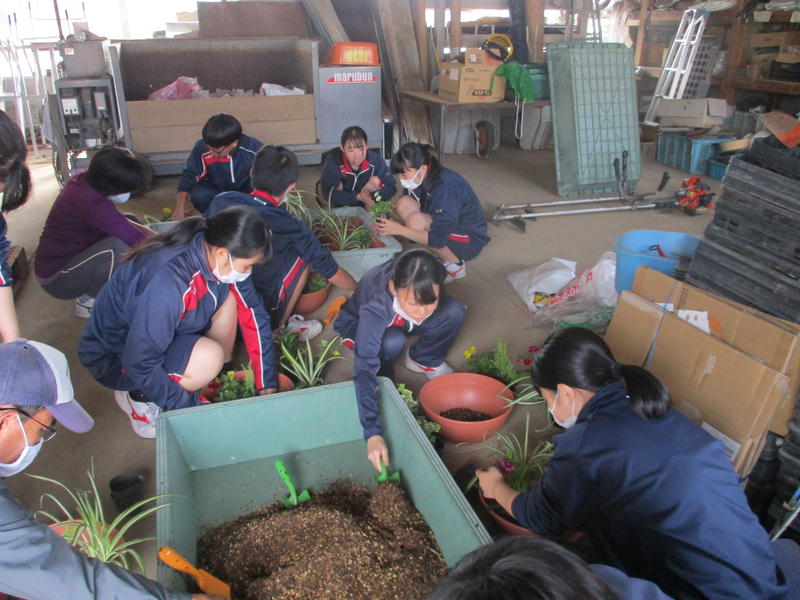 学校設定科目福祉園芸【3年普通科福祉コース】の授業風景です。ビオラ、パンジー、ナデシコ等の寄せ植えを行いました。通気性をよくするためにプランター底に赤玉土を入れ、花苗を選び、プランターに並べてみます。用土を入れ完成です。たっぷりかん水した後、温室で管理します。苗が根付き、花が多く咲いたら、実習でお世話になる施設へ持って行きます。