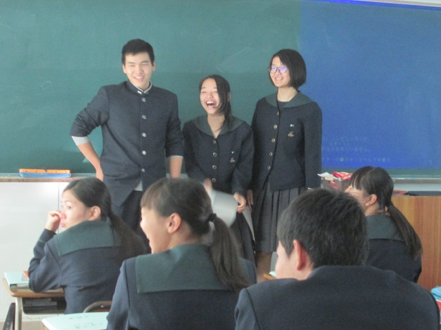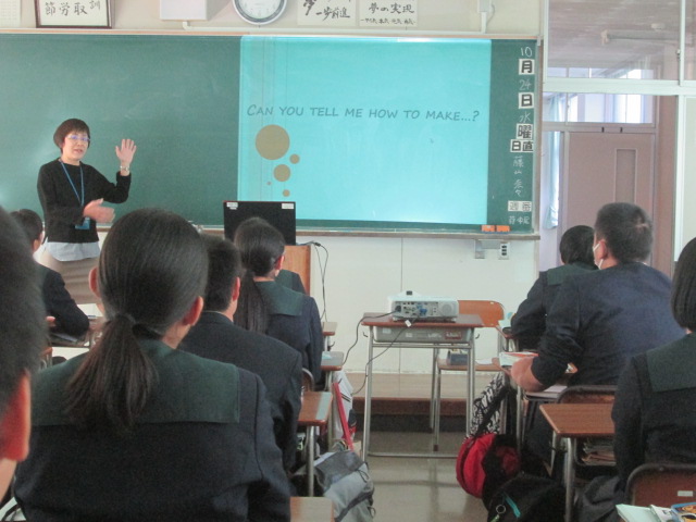 ・公開授業 英語(2018/10/24) 10月24日(水)2限目、3年食品科学科で井村先生が、コミュニケーション英語Ⅱの「料理のレシピ」というテーマで公開授業を行いました。「Can you tell me how to meke...?」料理のレシピを使って、手順を説明したり、手順を聞いて理解することが目標です。ボキャブラリーを整理し、役立つ表現を使って、英語で表現し合いました。
