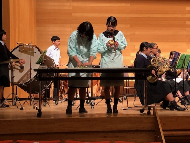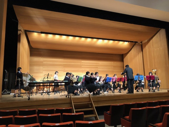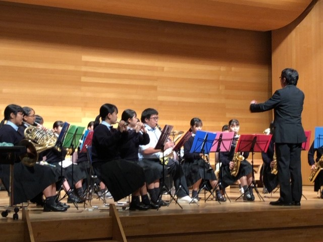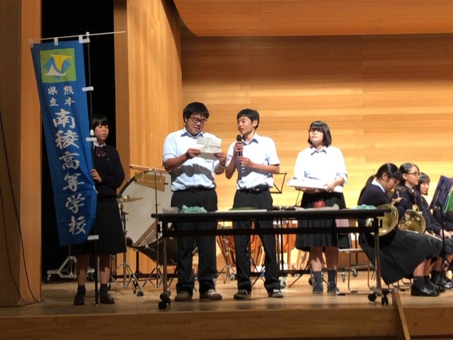 城南地区音楽会 投稿日時 : 2019/10/28 投稿者6 御船町カルチャーセンターにて、第45回城南地区高等学校交歓音楽会が行われました。 この音楽会は、日頃の学習や練習の成果を発表し、交流を深めることを目的としています。 本校吹奏楽部が参加をし、「ライオンキングメドレー」と「おもちゃの兵隊のマーチ」を演奏。 3年生の酒井君・早田君が学校のPRを、岡部さん・原口さんがきゅうりの早切りとりんごの皮むきを行い、 南稜高校をしっかりアピールしてきました!