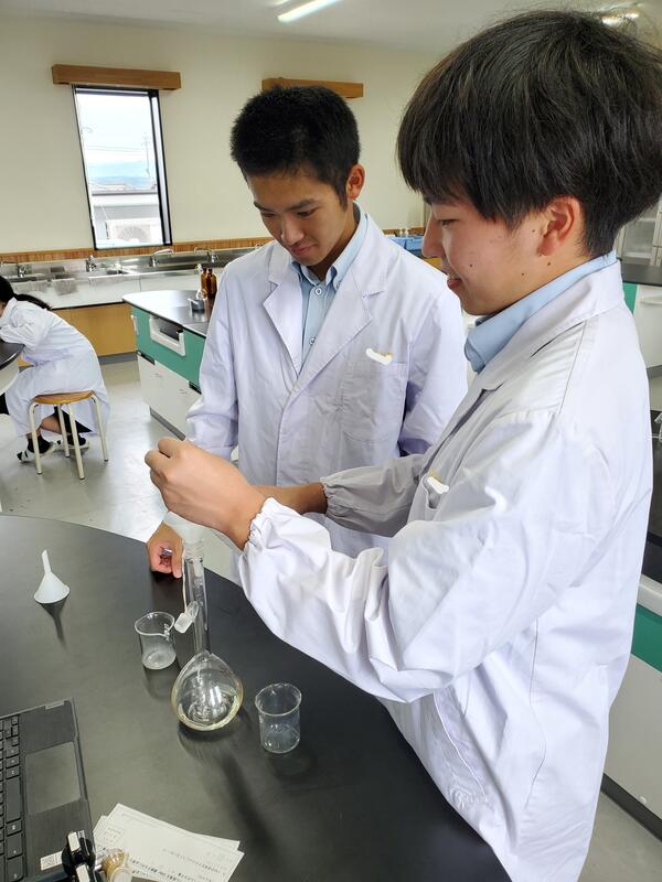 【食品科学科3年生】食品化学実験 投稿日時 : 2023/09/13 投稿者5 本日、3年生が食品化学実験の中和滴定に使用する試薬を作成しましたその様子をご覧ください 試薬の調整方法、注意点等を真剣に学習しています 電子天秤を使用して正確に試薬を精秤(正確に計量する意)しています 計量が終わった試薬を純水で完全に溶かしています 試薬が完全に溶けたらメスフラスコに移し入れてメスアップします(これがなかなか難しいです) 真剣にメスアップしています失敗したら、作り直しです 無事に完成したら褐色の試薬ビンに入れて作成完了ですお疲れさまでした~ タグ 食品科学科