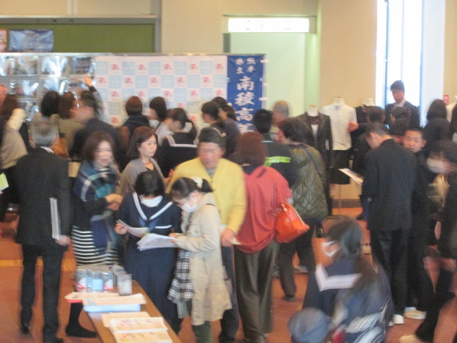 ・球磨・人吉地区県立高等学校 4校合同説明会 (2017/3/19) 投稿日時 : 2017/03/20 学校サイト管理者 ・球磨・人吉地区県立高等学校 4校合同説明会 (2017/3/19)3月19日(日)人吉カルチャーパレスにおいて、4校合同説明会を実施しました。中学1・2年生徒、保護者の方が対象です。新校開校にともない、初めての開催。各校30分間の中で学校概要などを説明。南稜高校からは、ステージの部で、ダンス部発表、NICC報告、概要説明(引地先生)を行い、展示の部では、生徒作品、生産物、活動の写真、制服などを展示しました。