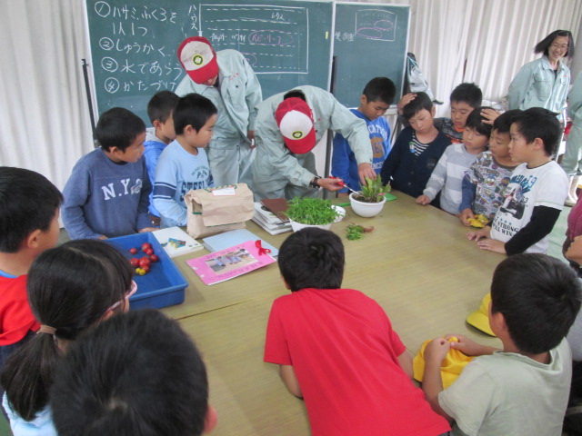 ・ふれあい体験 (2015/11/12) 投稿日時 : 2015/11/12 学校サイト管理者 ふれあい体験 (2015/11/12) 久米小学校3年生18名と先生3名、合計21名が来校。 本校生徒のアドバイスにより、ベビーリーフの収穫体験を行いました。収穫の方法の説明 温室で収穫