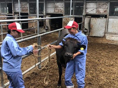 1年生は家でウシを飼っていて、小さい頃から扱っている生徒から、高校に入学して初めてウシを見た生徒まで様々。でも、みんな同じ実習に取り組みます。