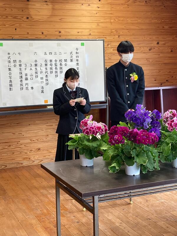 卒寮生挨拶 涙ながらにこれまでの感謝をしっかりと述べてくれました。生徒の言葉に周囲は涙が止まりません。