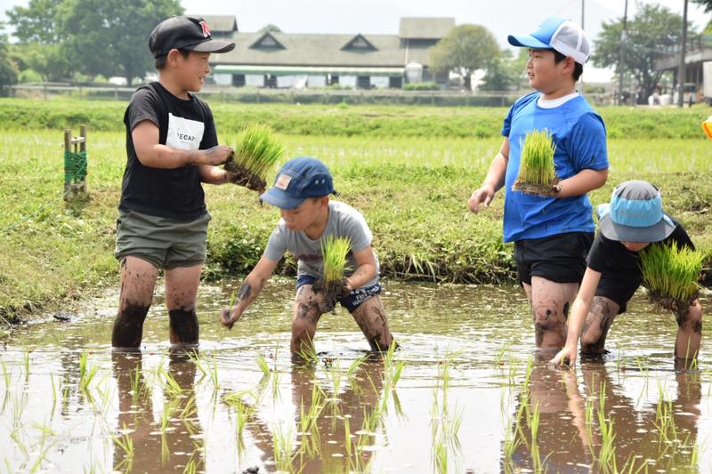 くまそアカデミーとの田植え交流体験 投稿日時 : 2019/06/24 学校サイト管理者 6月22日、球磨地域の小学生を中心に農業体験活動を行なっているくまそアカデミーの小学生24名と田植え体験を行いました。 田んぼに入る時は「わーーー」と声が上がったものの、田植えを始めると手際よくとてもスムーズでした。 田植え後は南稜米のおにぎりと差し入れのスイカを食べました。