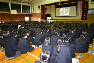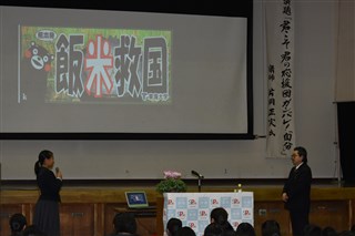 SPH講演会 投稿日時 : 2017/12/14 学校サイト管理者 本日、本校の体育館に東海大学九州キャンパスの片岡正実先生をお招きし、「君こそ君の応援団 頑張れ自分」という演題でSPH講演会が行われました。これからの日本の在り方や、農業の工夫について、示唆に富むお話を聞かせていただきました。