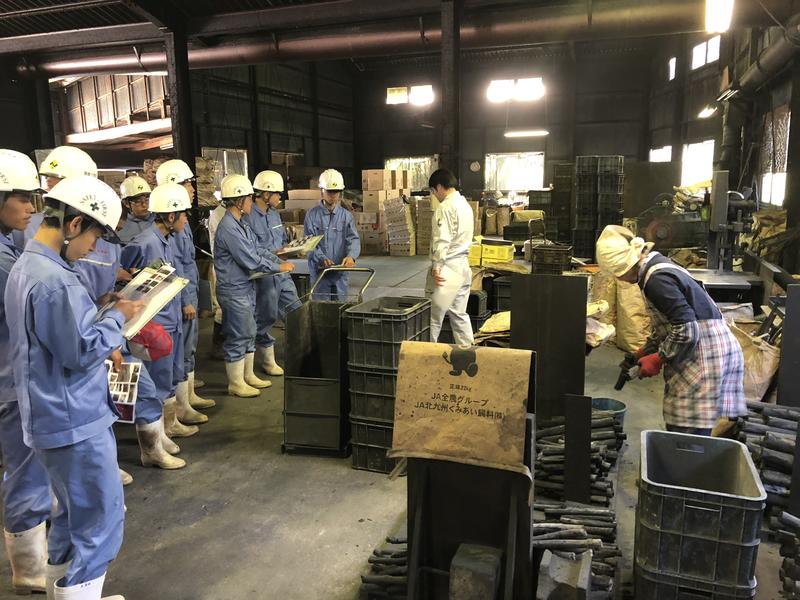 その後あさぎり町に戻り、尾鷹林業の製炭工場にて、搬出されたカシ類の広葉樹から造られる炭づくりの行程を学びました。
